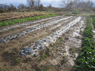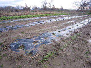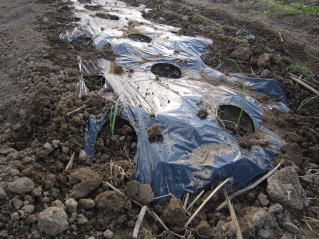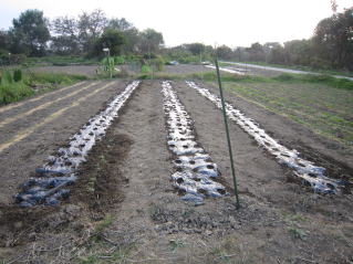 | 種蒔きが9月下旬、苗が小さい。しかし、この機を逃せない。2024.10.26 10:50 | マルチに穴を開け、1本ずつ定植。2024.10.26 10:50 | ||||||||||||||||||||||||||