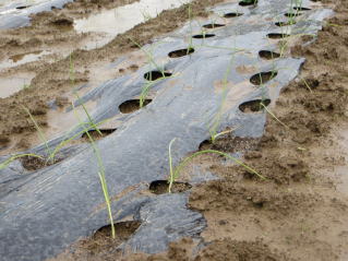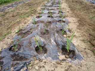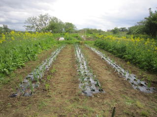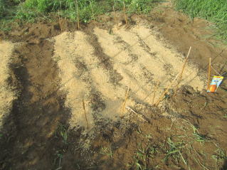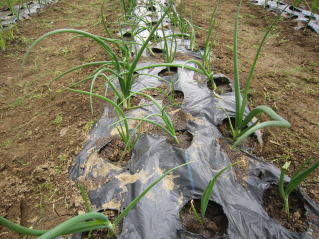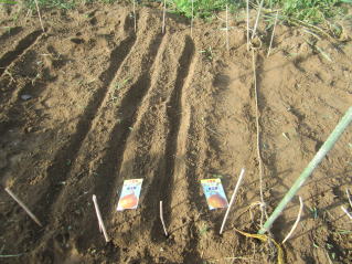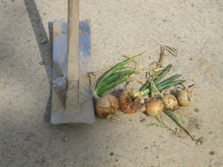 | タマネギはホームセンターで苗として売っているようですがコスト高。おらホでは秋に種を蒔いて苗を作り、定植します。収穫は翌年6月頃です。 種まき 蒔き時 例年9月1日前後にしている。人によってはポットに種を蒔き適当な大きさ(つまようじくらいの太さ、大きさ)になってから移植するが、おらホでは家庭菜園内で苗を作ってきた。 割り箸くらいの太さになってから定植している。 蒔き方 @良く耕した地面に高さ15センチ、幅45センチほどの床を作ります。 Aこの床に深さ3センチほどの溝を3本切ります。 Bここに1粒づつ種を筋蒔き風に置いていきます。この時まだ土を上掛けしません。 C買い求めた種の残り具合を確かめ、残っていたら適当に蒔き、足りないようだっらB種を拾い集め適宜蒔いていきます。 D土をかけてからその上に籾殻を籾殻を蒔きます。 ポイント 出来るだけ均等に薄く蒔き、間引きしないように心がけています。 手入れ 肥料 芽が出たら顆粒状肥料、尿素を蒔いています。ネギ類は肥料を与えた分だけ大きくなるようです。 雑草取り 雑草取りはマメにしなければなりません。 定植 準備作業 @良く耕した地面に尿素、油かすなど均等に降り、更に良く耕し数日間放置しておきます。 Aマルチ(黒いビニール)を敷き、固定します。これをまた、数日間程度放置しておきます。 定植 @穴開け器しい1畝3列、15〜20センチ間隔となるようにとなるように穴を開けていきます。 A1本ずつ苗を植えていきます。 定植後の手入れ 肥料 ネギ類は肥料を好むとありましたので、顆粒状肥料、尿素を2回ほど投入しています。おらホでいうサクヅカゲです。 収穫 例年6月中下旬頃でしょうか。適当な大きさのものから適宜収穫していきます。 |