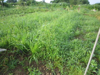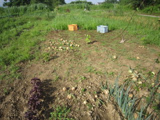 | これが玉ネギ畑?雑草ジャングルと化した。2025.06.28 5:50 7:25 | 雑草取りしながらのタマネギ収穫。根を上にしての天日干し。2025.06.28 7:25 | ||||||||||||||||||||||||||