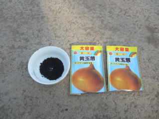 | 今年のタマネギの種。一番安価なも野を購入した。2025.08.17 6:24 | 三角鍬で溝を切り、均一に種をまく。厚くならないように注意しした。2025.08.17 6:39 | ||||||||||||||||||||||||||