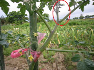 幹と枝の境目に脇目が出てきますがこれを忘れずに除去します。これを怠るとお化けのような枝ばかりのトマトになってしましまいます。