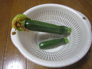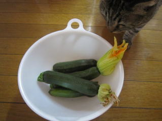 ズッキーニの収穫。右上はお我が家の主、モモちゃん。2025.06.22 10:10 |