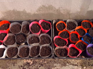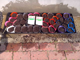 | 1袋198円の種。2026.03.28 9:53 | 園芸土を使用済ポットに入れ、これにバラ蒔き風に種まき。2026.03.28 9:54 |