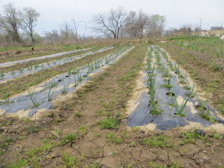| 雑草取り、追肥を待つタマネギ。2026.04.04 10:20 | 雑草取り、追肥を待つニンニク。2026.04.04 10:20 |